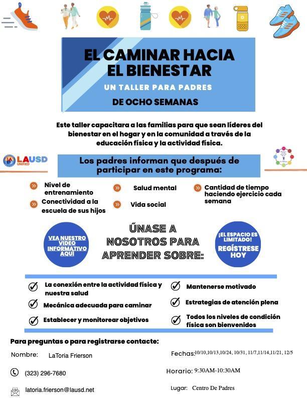 Taller para padres de 8 semanas con el Asesor de Recursos, del 10 de octubre al 5 de diciembre, de 9:30 a 10:30 h, en el Centro para Padres. Capacita a las familias para ser líderes de bienestar en casa y en la comunidad. Únase para aprender sobre: la mecánica correcta de la caminata, el establecimiento y mantenimiento de metas, y la motivación. Se aceptan personas de todos los niveles de condición física.