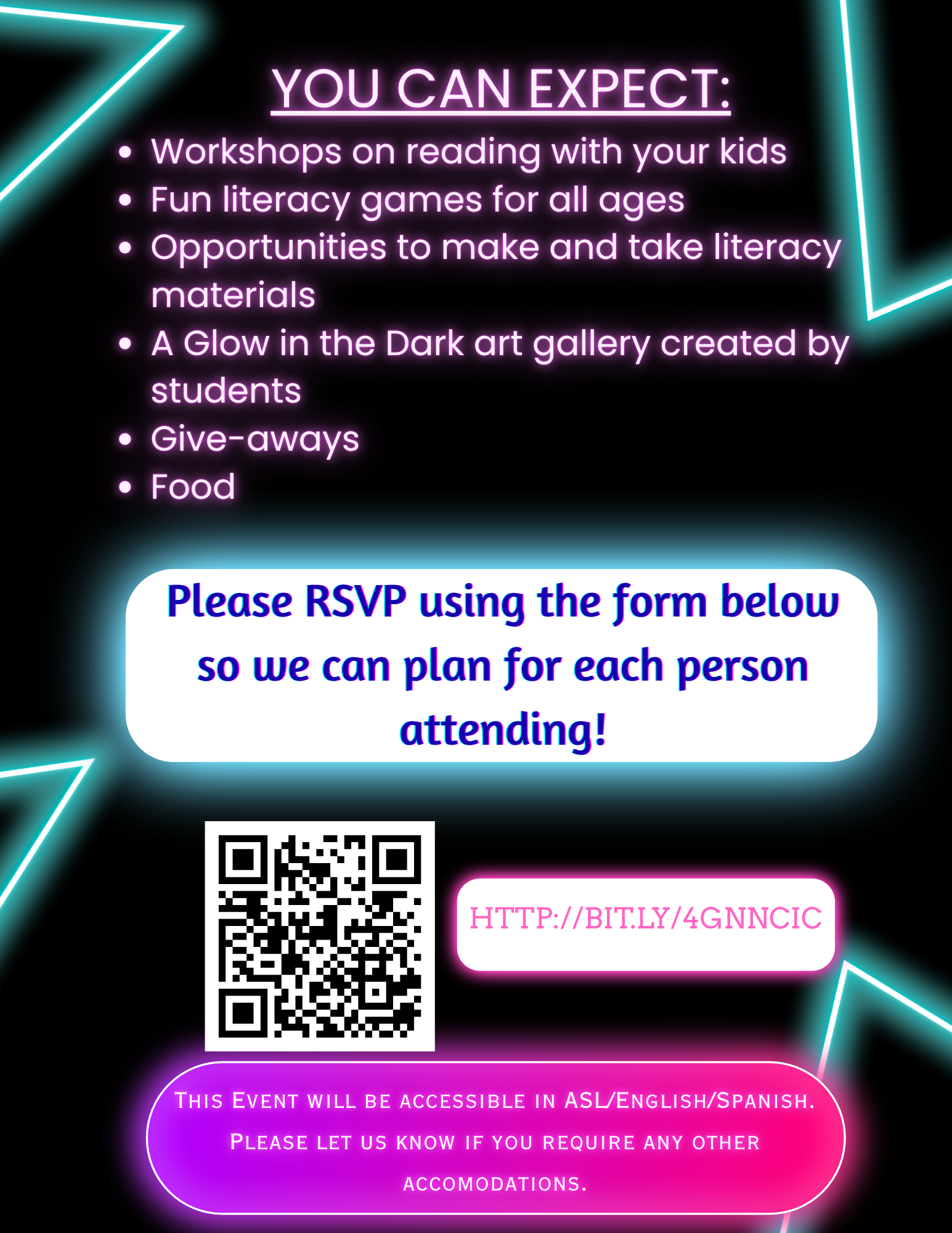 A Family Literacy Night is a school or community event designed to encourage a love of reading and writing among families. These events bring students, parents, and educators together to participate in fun, engaging activities like storytelling, literacy-based games, crafts, and interactive writing exercises, while also providing parents with resources and strategies to support their child's literacy skills at home